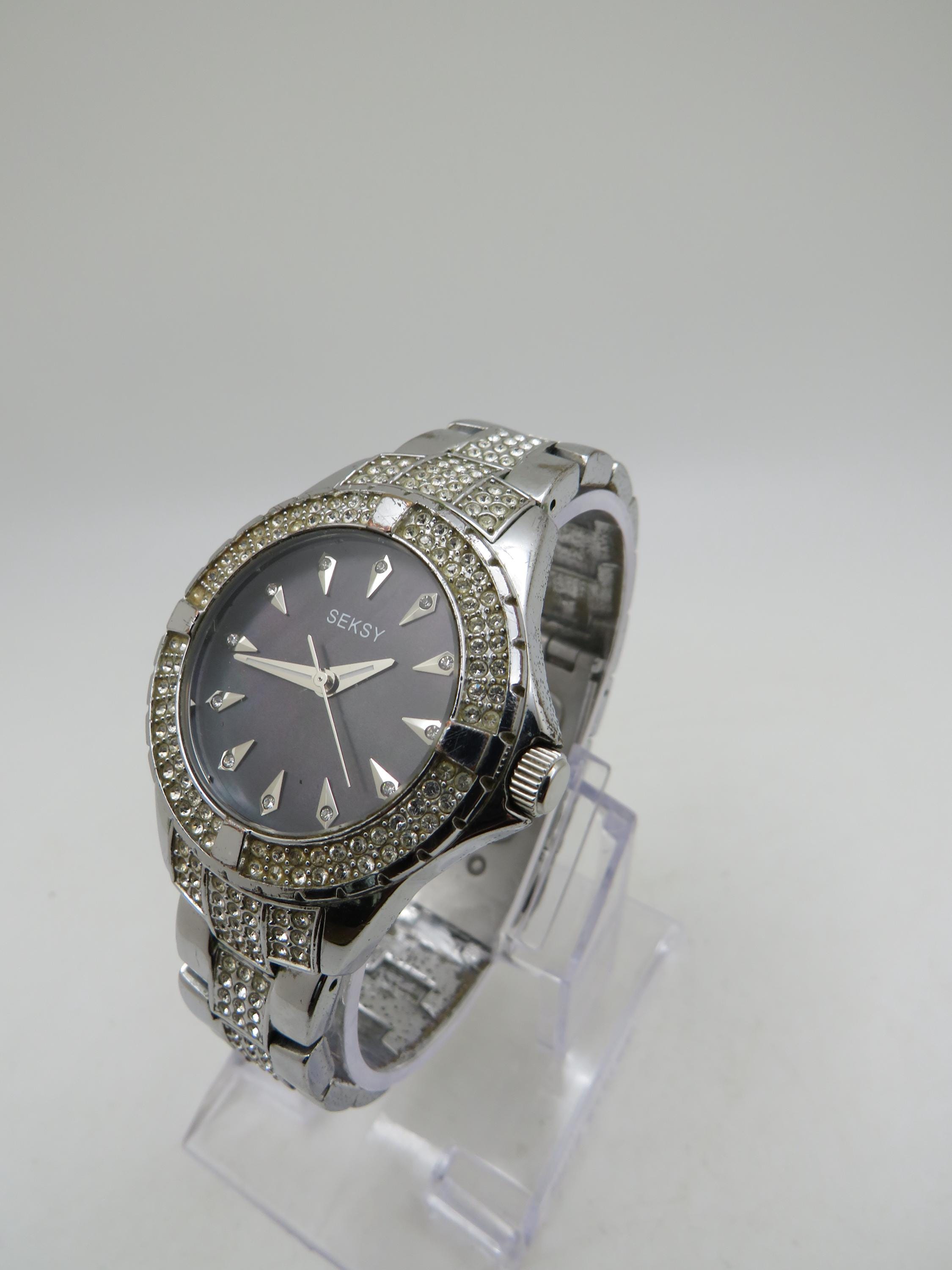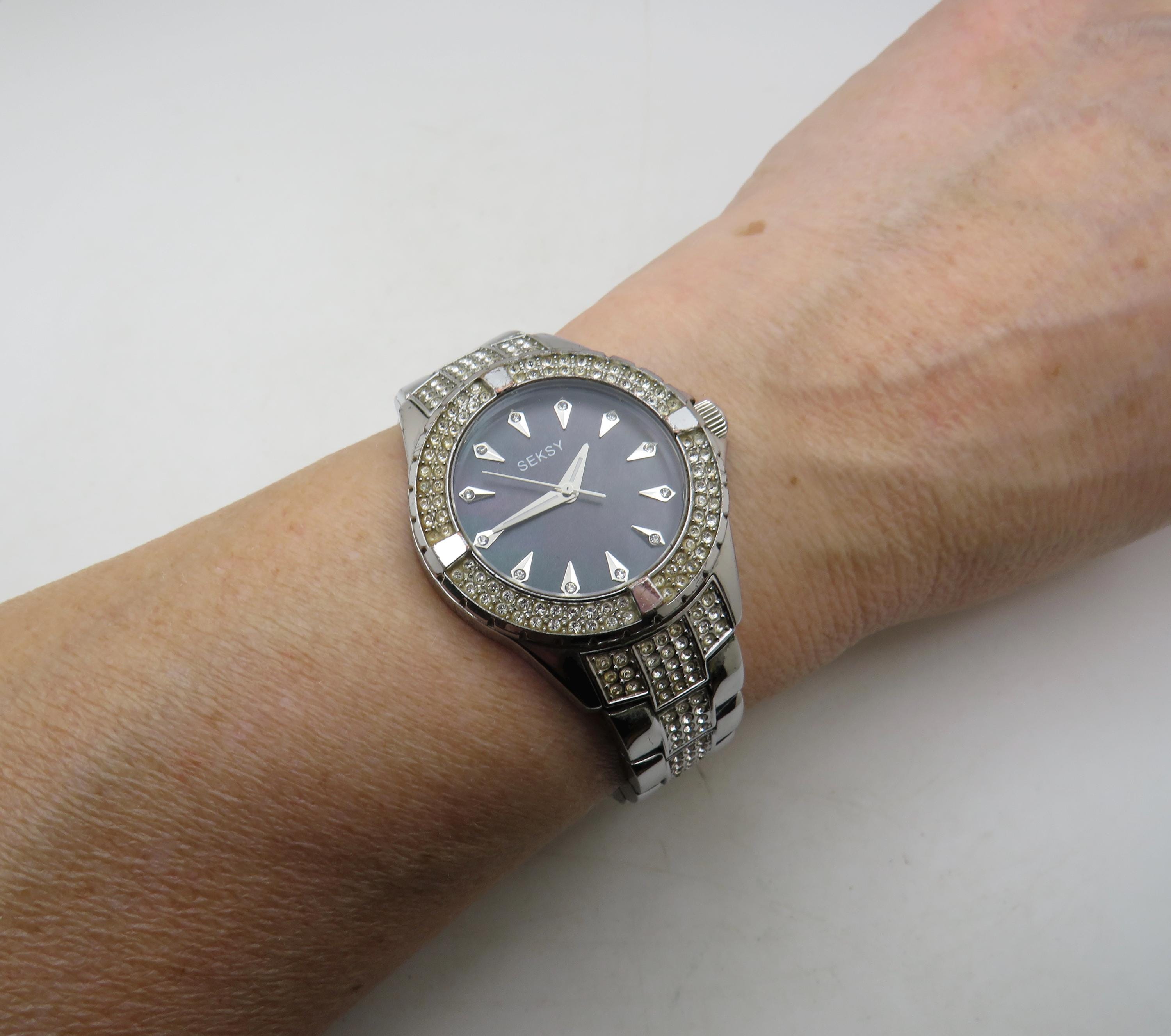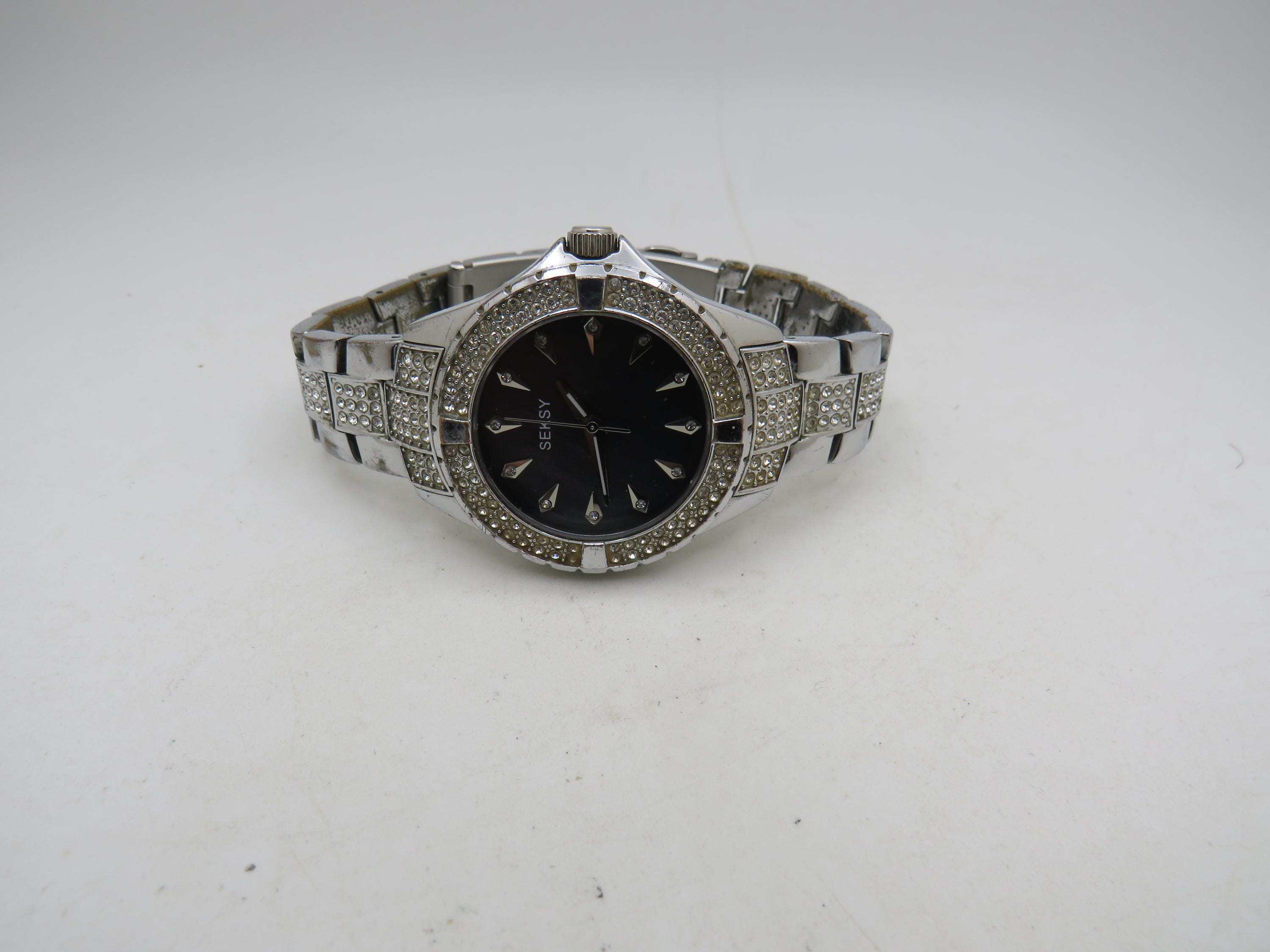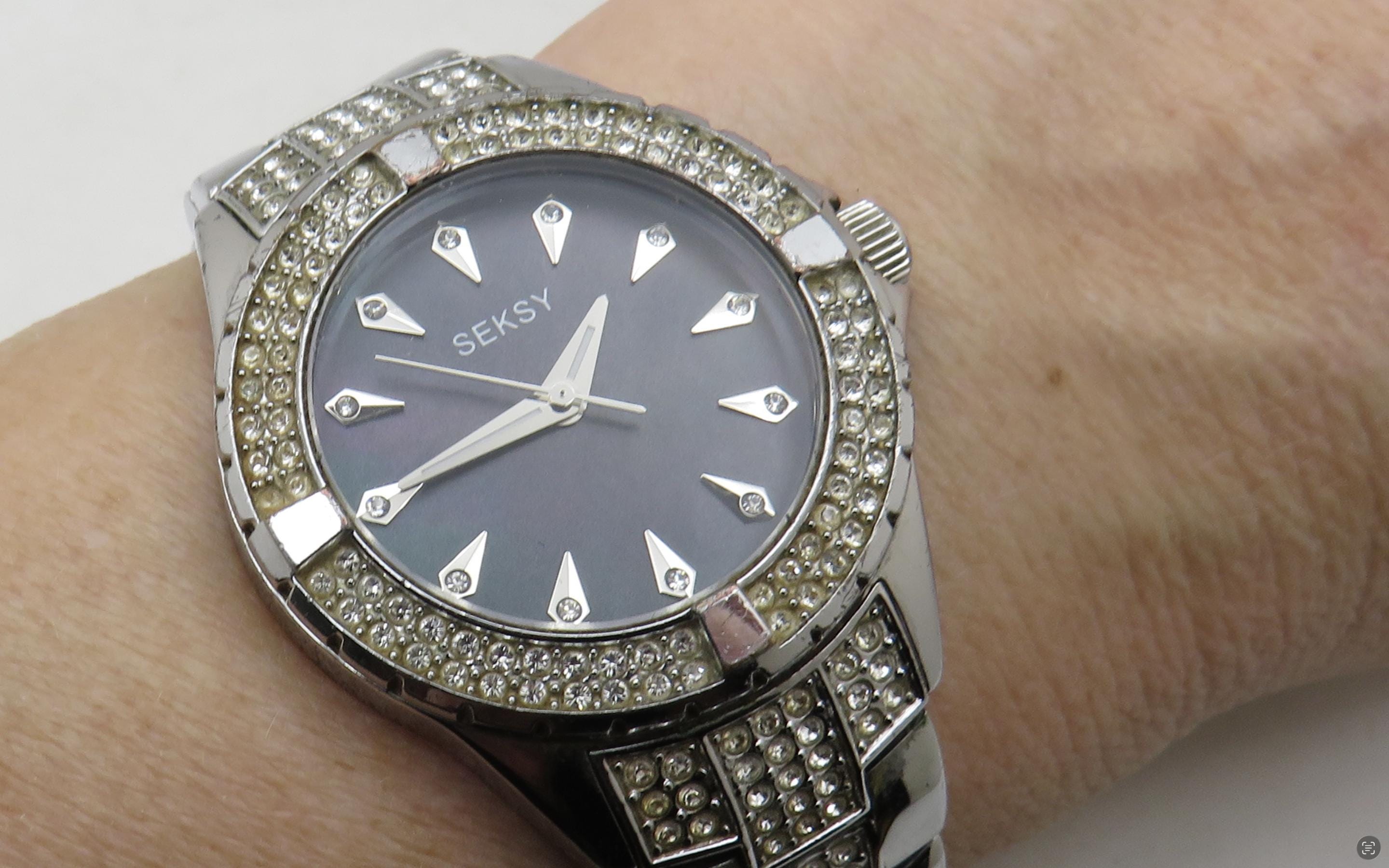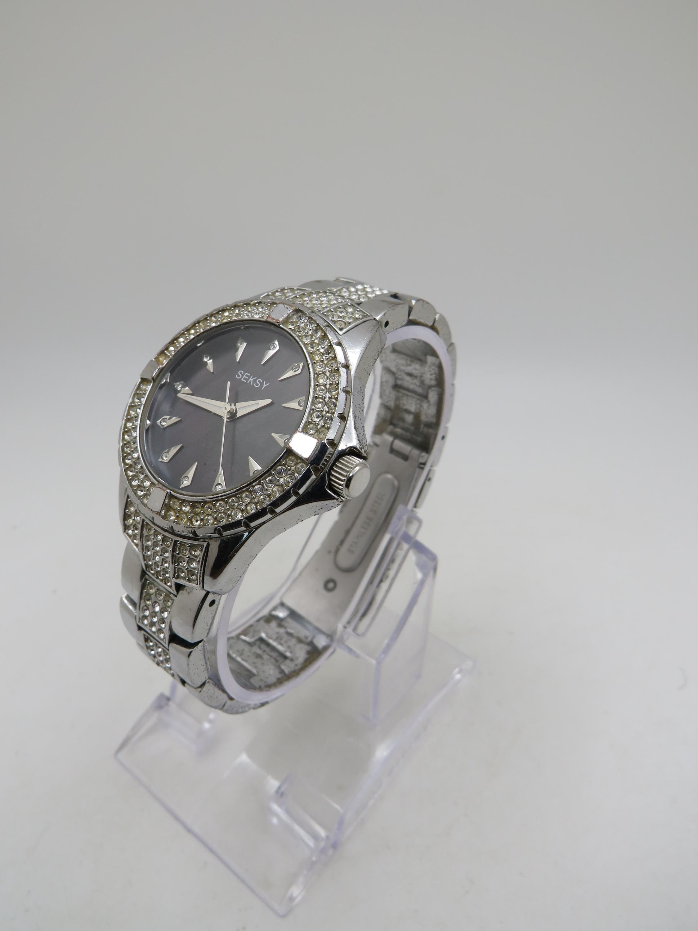 Vintage Sesky Watch: diamond, Stainless Steel, black Pearl Dial, 7" wrist size (q7)